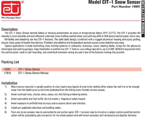R – Non. Les dispositifs de contrôle de la neige et les capteurs ne sont pas nécessaires pour un fonctionnement correct et sûr du système de câble chauffant Heat-Line car ils sont autorégulés et ne nécessitent pas de contrôles de limite haute. Cependant, dans les grandes applications résidentielles et commerciales/industrielles, l’ajout d’un dispositif de contrôle de la neige et de capteurs augmentera considérablement l’efficacité opérationnelle.