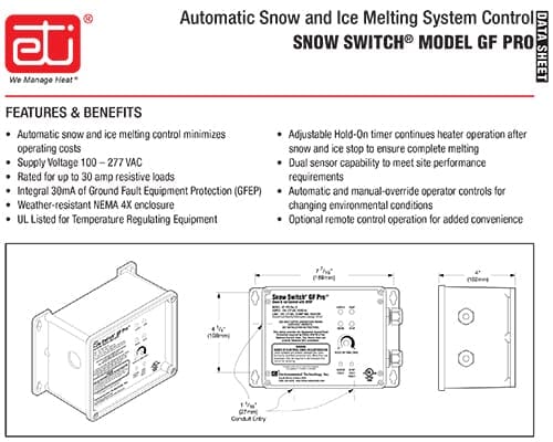 Contrôleur automatique de fonte de neige et de glace pour les toits, les gouttières et les descentes d’eau dans les environnements commerciaux et résidentiels. Boîtier de type NEMA 4X avec PECDT 30mA intégré. Le GF-PRO nécessite au moins un capteur, mais peut être installé avec jusqu’à deux capteurs, tels que GIT-1 et CIT-1.