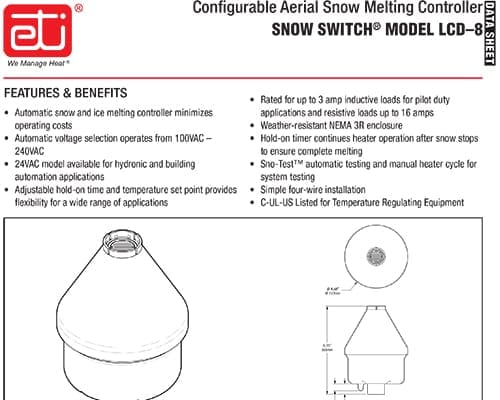 Un interrupteur autonome configurable pour la fonte automatique et rentable de la glace et de la neige. Conçu comme un capteur de neige aérien alternatif et rentable pour les petites applications commerciales et résidentielles. Le LCD-8 détecte la température et les précipitations, comme la neige qui tombe ou la poudrerie en cas de températures froides. Un contrôleur PD-PRO ou GF-PRO n’est pas nécessaire.