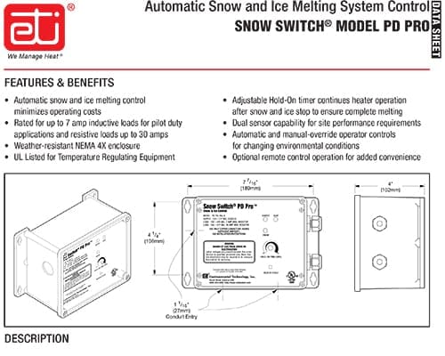 Contrôleur automatique de fonte de neige et de glace pour les toits, les gouttières et les descentes d’eau dans les environnements commerciaux et résidentiels. Boîtier de type NEMA 4X. Le PD-PRO nécessite au moins un capteur, mais peut être installé avec jusqu’à deux capteurs, tels que GIT-1 et CIT-1. Le PECDT n’est pas inclus.