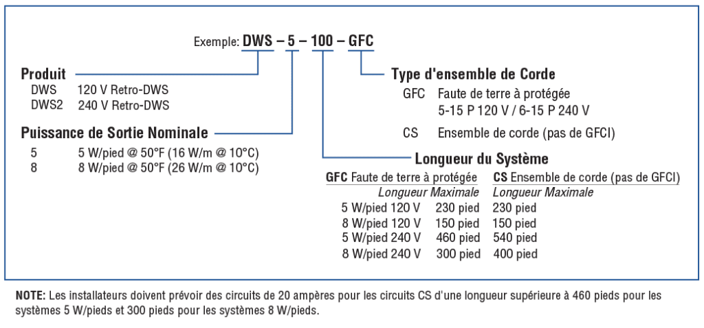- Systèmes à 240 volts – 5 watts/pied à 50°F (10°C), longueur maximale 540 pieds (165 m)