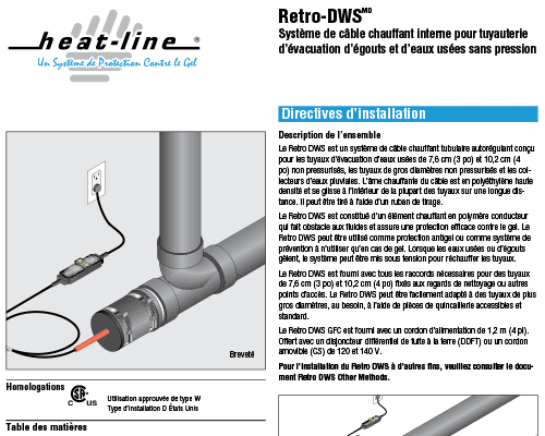 R – Retro-Line est un système approuvé pour le chauffage interne des conduites d’alimentation en eau potable et des conduites de pompes de puisard. Retro-DWS est conçu pour des installations sûres et approuvées pour l’intérieur des tuyaux d’égouts et d’autres fonctions où réchauffer est souhaitée lorsque des gaz méthane peuvent être présents ou dans de grandes canalisations où une protection ou. Le Retro-DWS est conçu strictement pour les applications non pressurisées où le Retro-Line est homologué par la CSA pour 75 lb/po2.