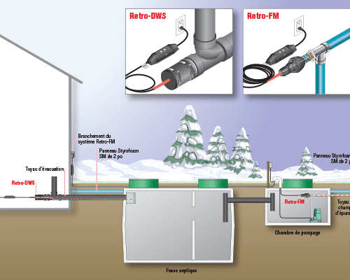 – Il est important de se rappeler, lors des mesures, que l’objectif est de fournir une protection contre le gel sur toute la section du tuyau ou de l’égout qui risque de geler. Le Retro-DWS doit être relié au tuyau de drainage dans un espace chauffé du bâtiment et aller jusqu’à la fosse septique située sous la ligne de gel.